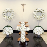 Conjunto contendo 1 portal + 1 quadro com foto + 2 arranjos + 1 coração master confeccionados com orquídeas phalaenopsis brancas e folhagens guaricana (suportes não inclusos).